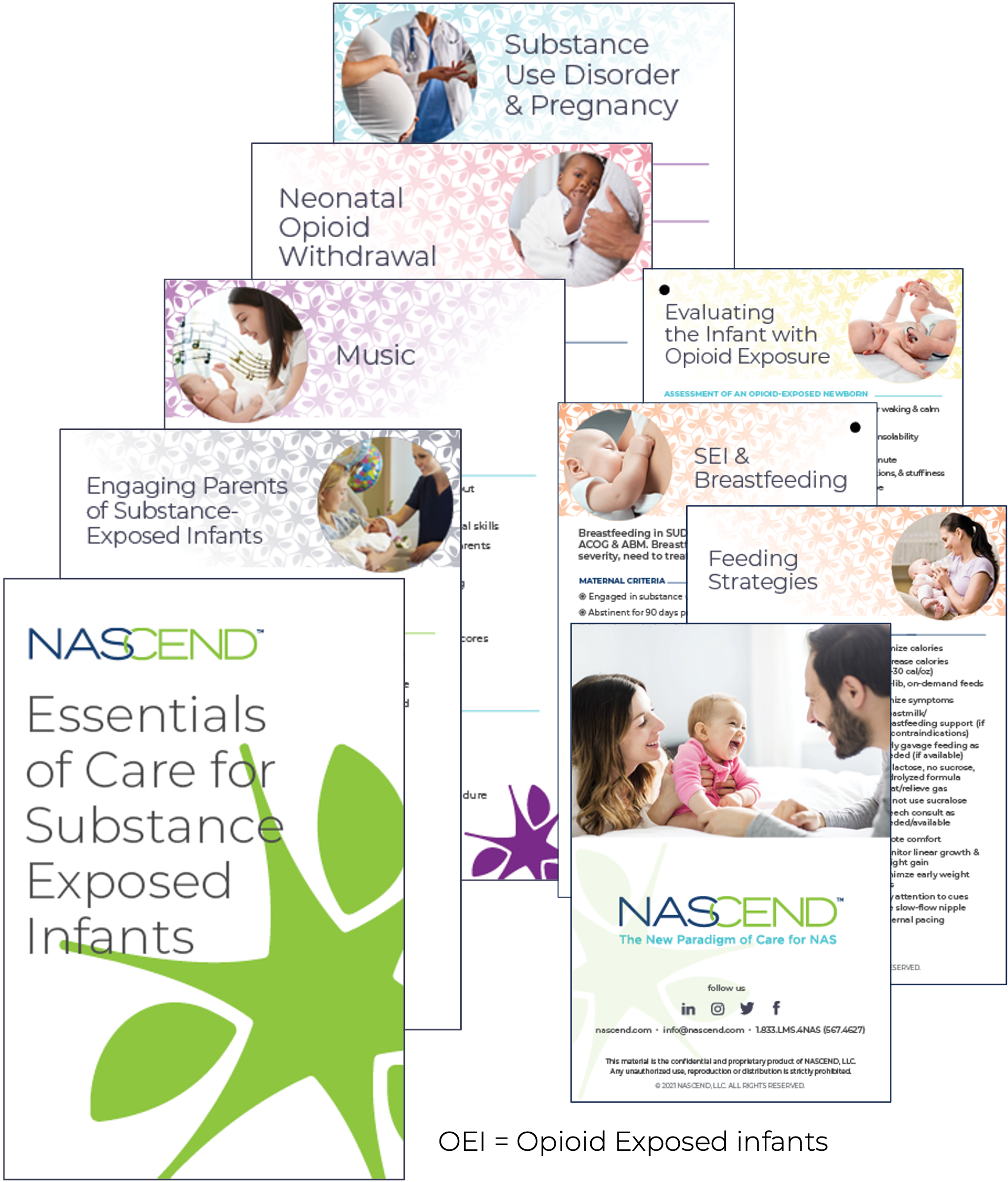 NASCEND has created a robust set of reference cards that capture the key take-aways from both our live training and web-based education on providing care for substance exposed infants and their families. The cards are vinyl for longevity and easy cleaning, as needed.